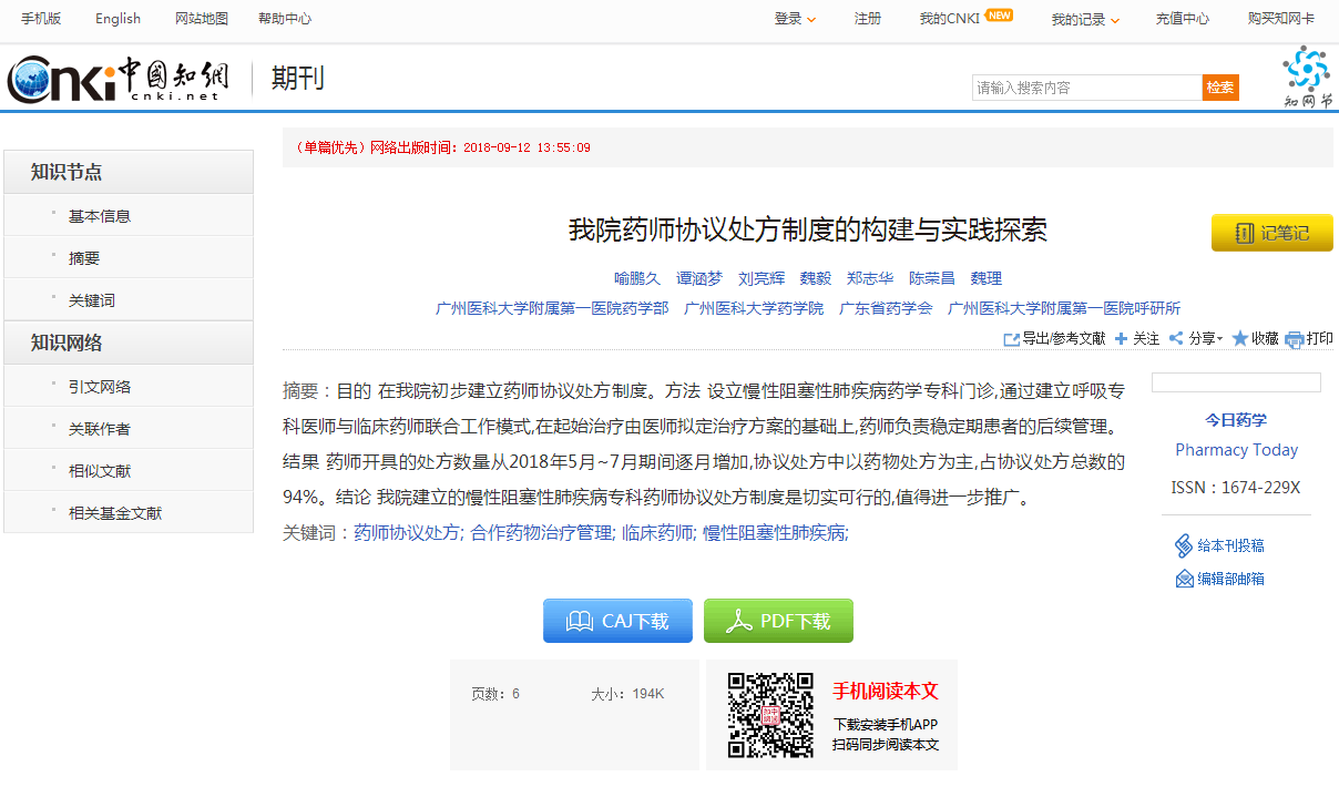 广州医科大学附属第一医院的药师协议处方制度的构建与实践探索在本会官刊——《今日药学》杂志发表