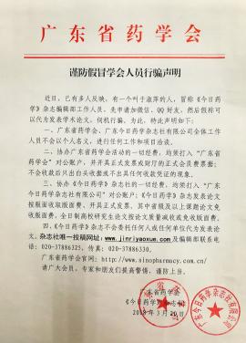 近日,已有多人反映,有一个叫于淑萍的人,冒称《今日药学》杂志编辑部工作人员,先申请加微信、QQ好友,然后假称可以代为发表学术论文,伺机行骗。为此,特此声明如下:一、广东省药学会、广东今日药学杂志社有限公司全体工作人员不会以个人名义,进行任何工作和项目洽谈。二、协办广东省药学会活动的一切经费,均须打入“广东省药学会”...发布时间:2018-03-20 15:40:30 | 浏览:1297 -